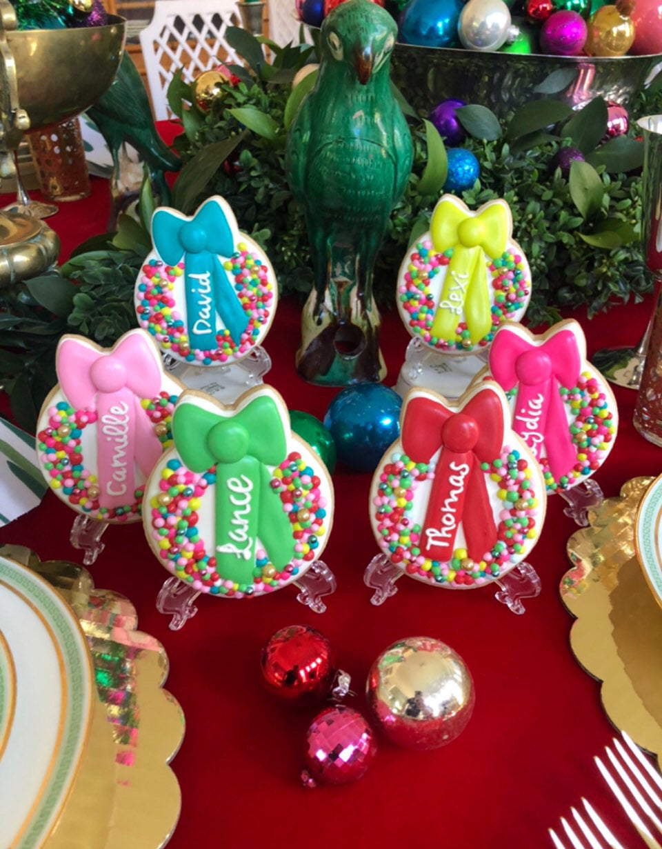 This adorable cookie design features a round wreath shape with a bow on top—just like a Christmas ornament! Decorate it with royal icing “sprinkles,” piped holly leaves, or personalize it with names for a beautiful holiday place setting.