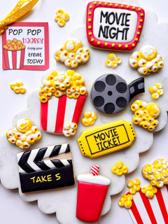 In this Movie Night Online Class, you’ll be guided step-by-step on how to decorate delicious cookies that fit the movie night theme. This class is designed for decorators of all skill levels, so whether you're new to royal icing or a seasoned pro, you'll leave with the knowledge to create stunning cookies every time!